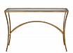 Изящно изогнутое железо ручной ковки, отделанное сильно состаренным золотым листом. Верх - прозрачное закаленное стекло со скошенной кромкой.